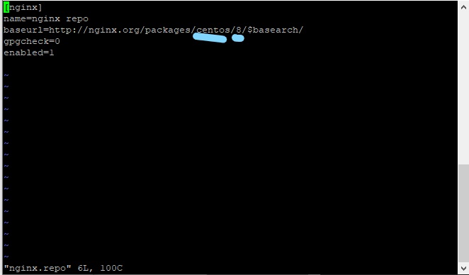 sudo vi /etc/yum.repos.d/nginx.repo내용은 아래와 같이 입력하고 밑줄친 부분을 자신의 os에 맞게 수정해주면된다. 사용한 OS는 Centos이고 8버젼이기 때문에 알맞게 수정해준 뒤 :wq로 저장하고 나온다.