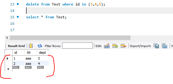 delete from Test where id in (3,4,5); 쿼리문으로 id가 3,4,5인 데이터를 삭제하였다.
