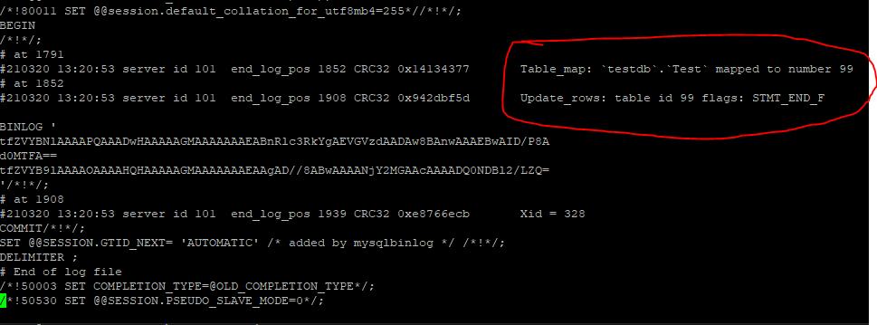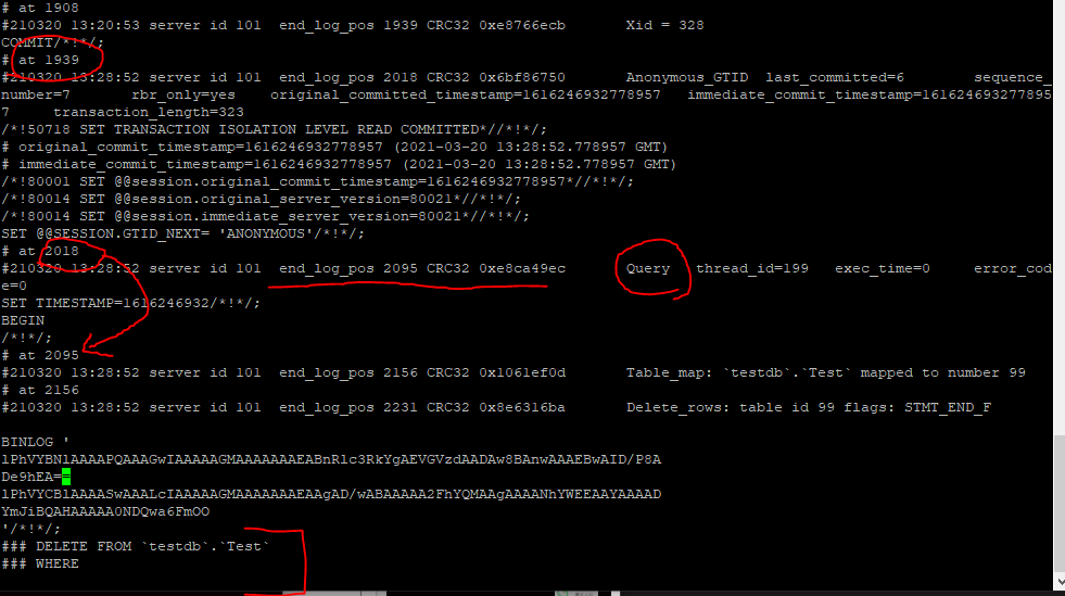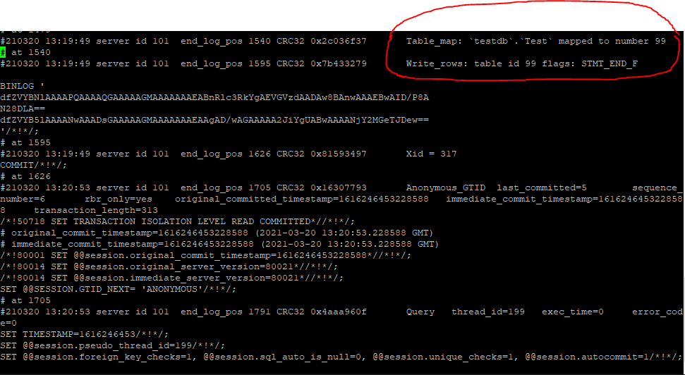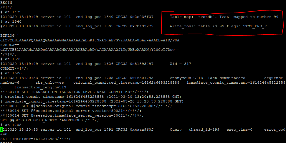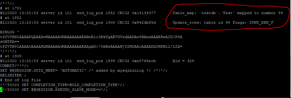 mysqlbinlog --no-defaults --start-datetime="2021-03-20 13:19:49" --stop-datetime="2021-03-20 13:28:52" -d testdb binlog.000005 > t2.log