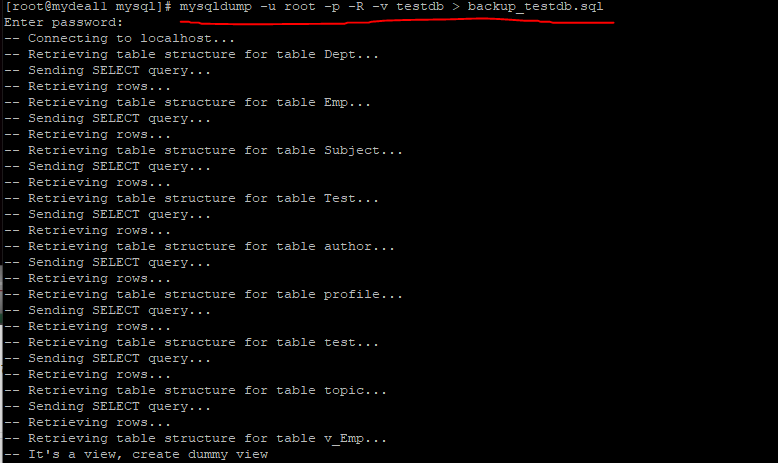 mysqldump -u root -p -R -v testdb > backup_testdb.sql