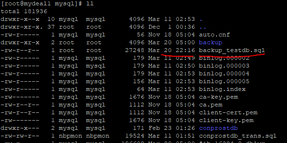 해당 명령어를 사용해 backup_testdb.sql 파일을 만든다. -R옵션은 데이터뿐만 아니라