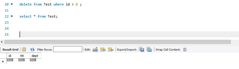 id는 모두 0보다 크니 id > 0 조건으로 실수로 데이터를 삭제해보자