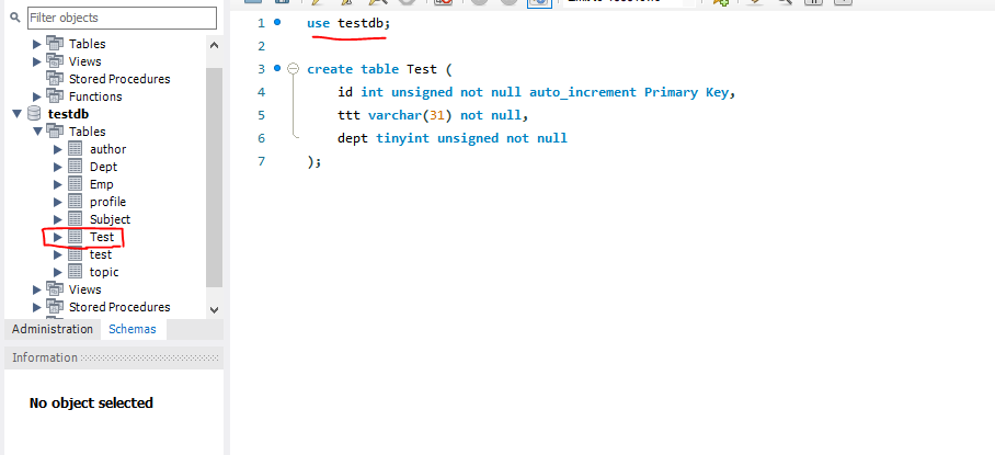 create table 쿼리문을 사용하여 Test테이블을 추가한다.